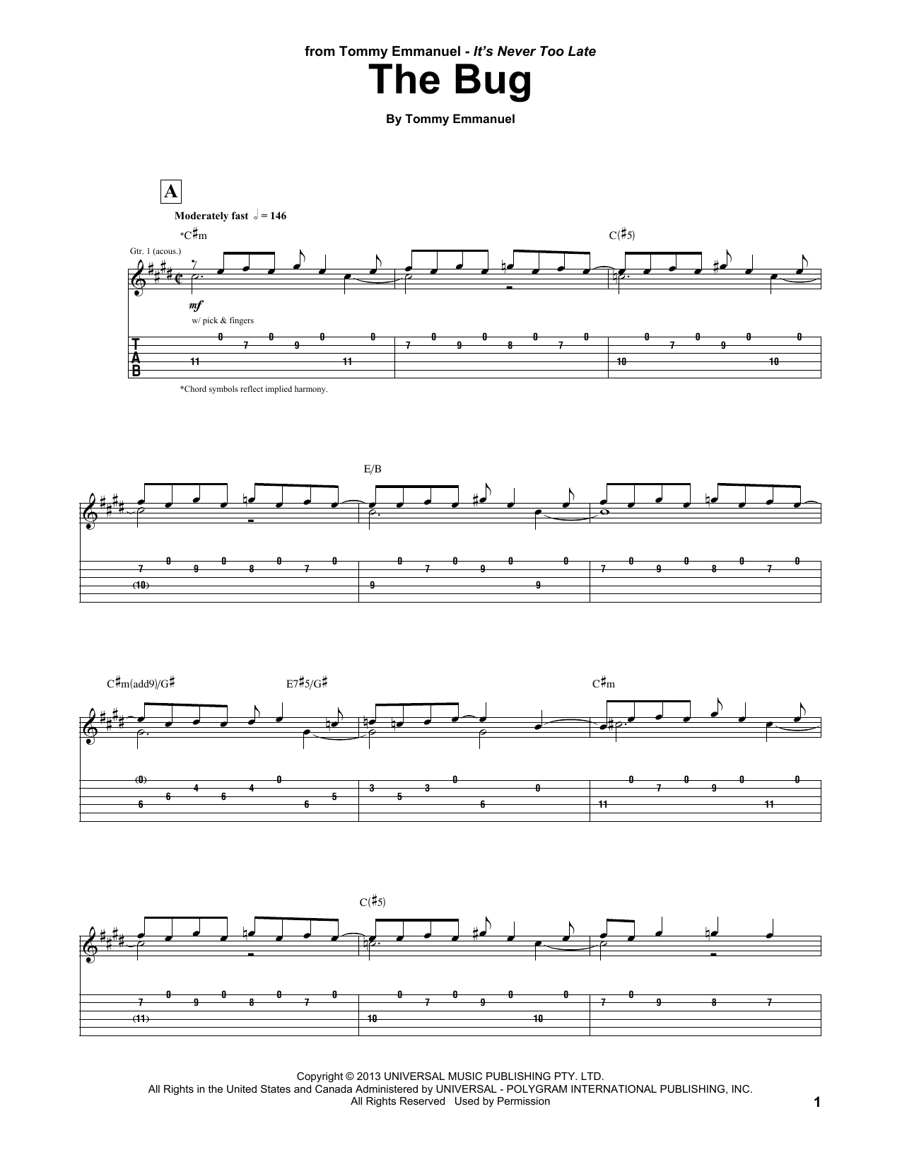Download or print Tommy Emmanuel The Bug sheet music, chords and digital score arranged for Guitar Tab. This Jazz score includes 6 page(s).