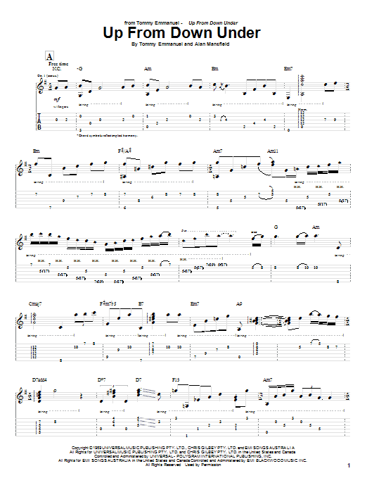Download or print Tommy Emmanuel Up From Down Under sheet music, chords and digital score arranged for Guitar Tab. This Jazz score includes 12 page(s).