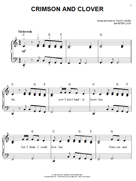 Download or print Tommy James And The Shondells Crimson And Clover sheet music, chords and digital score arranged for Piano, Vocal & Guitar Chords (Right-Hand Melody). This Oldies score includes 5 page(s).