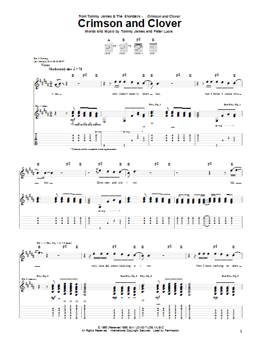 Download or print Tommy James & The Shondells Crimson And Clover sheet music, chords and digital score arranged for Easy Ukulele Tab. This Pop score includes 3 page(s).