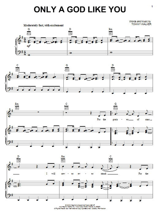 Download or print Tommy Walker Only A God Like You sheet music, chords and digital score arranged for Piano, Vocal & Guitar Chords (Right-Hand Melody). This Christian score includes 5 page(s).