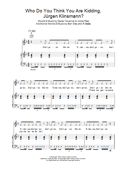 Download or print Tonedef Allstars Who Do You Think You Are Kidding, Jurgen Klinsmann? sheet music, chords and digital score arranged for Piano, Vocal & Guitar Chords. This Pop score includes 5 page(s).