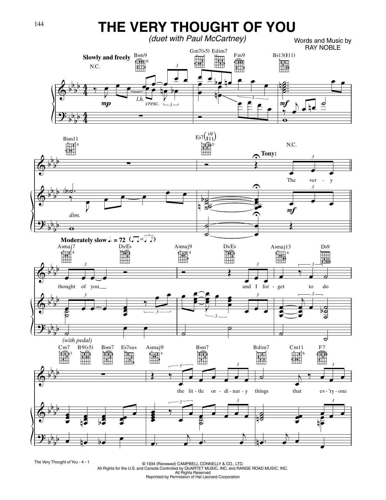 Download or print Tony Bennett and Paul McCartney The Very Thought Of You sheet music, chords and digital score arranged for Piano, Vocal & Guitar Chords (Right-Hand Melody). This Jazz score includes 4 page(s).