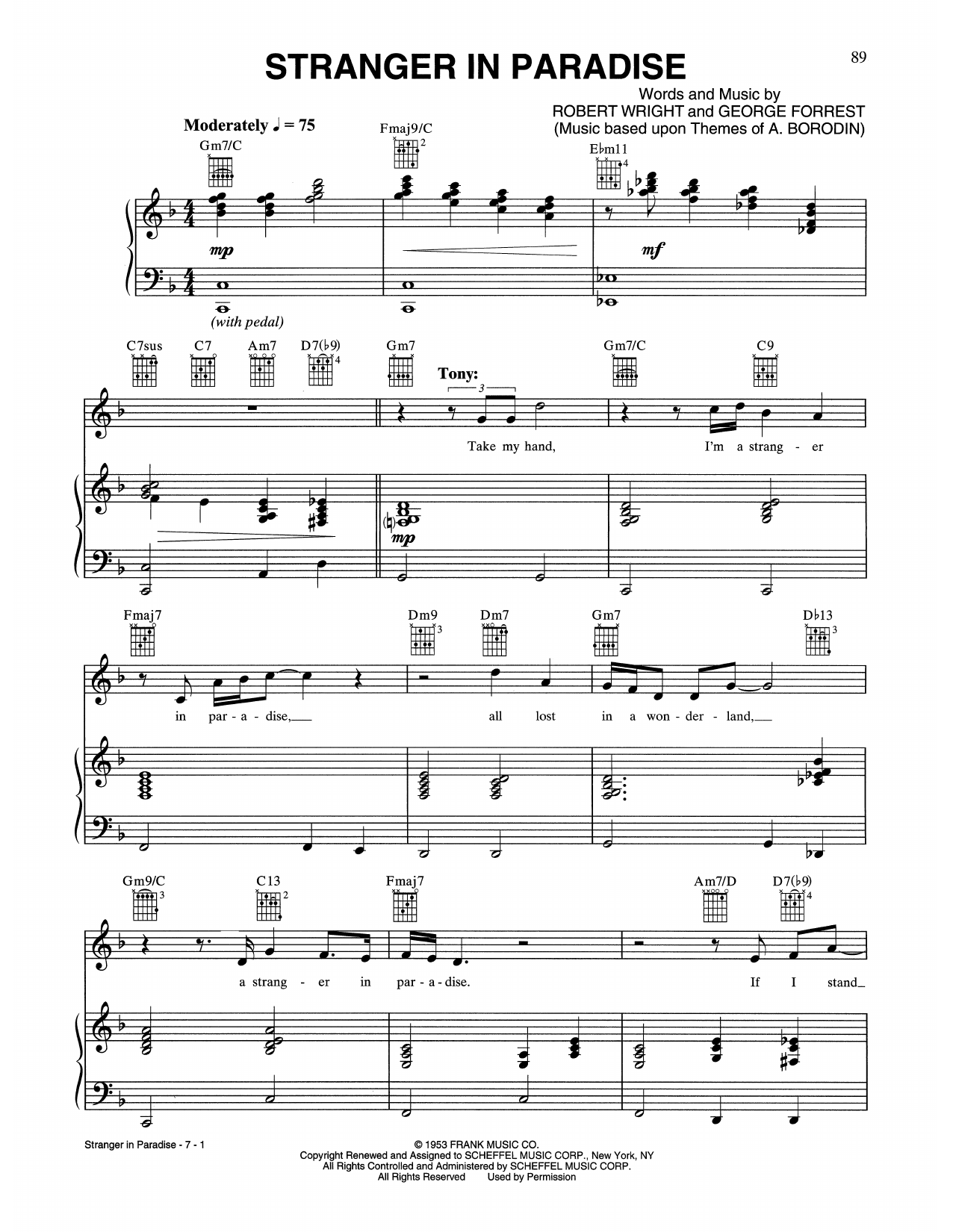 Download or print Tony Bennett & Andrea Bocelli Stranger In Paradise sheet music, chords and digital score arranged for Piano, Vocal & Guitar Chords (Right-Hand Melody). This Jazz score includes 7 page(s).