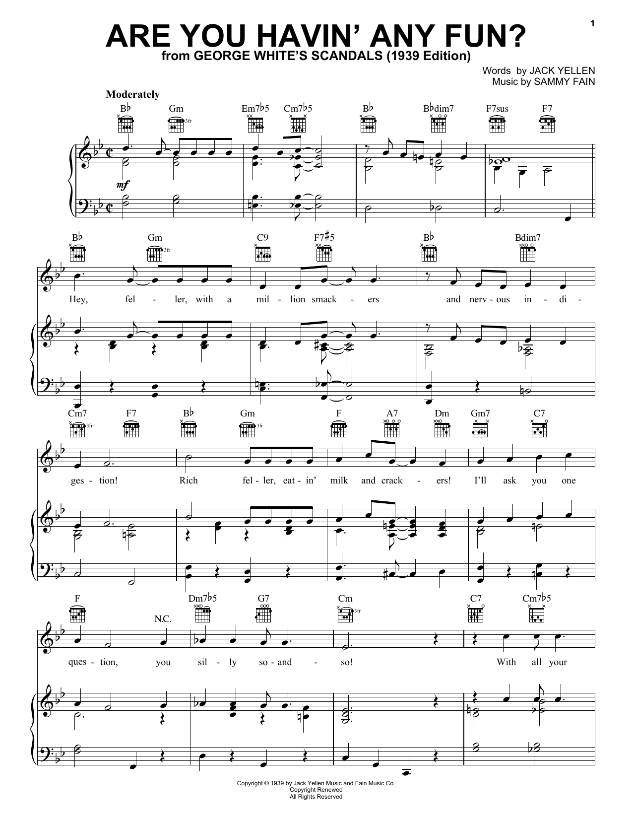 Download or print Tony Bennett Are You Havin' Any Fun? sheet music, chords and digital score arranged for Real Book – Melody & Chords – Bass Clef Instruments. This Jazz score includes 1 page(s).