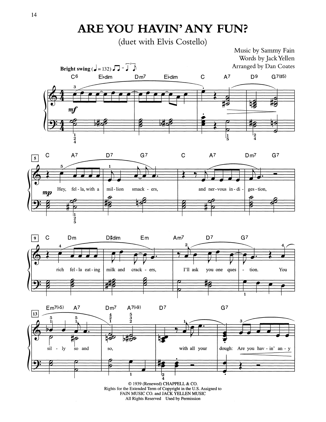 Download or print Tony Bennett & Elvis Costello Are You Havin' Any Fun? (arr. Dan Coates) sheet music, chords and digital score arranged for Easy Piano. This Jazz score includes 4 page(s).