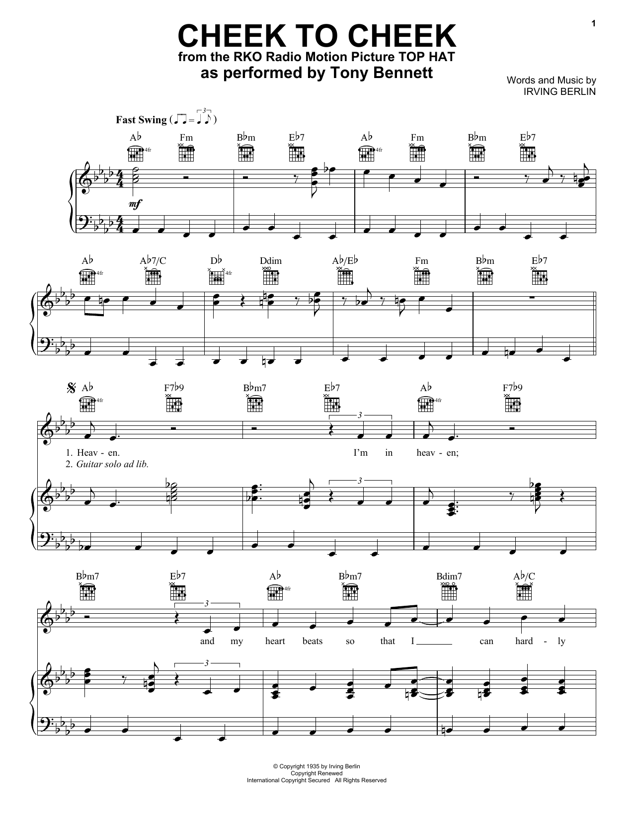 Download or print Tony Bennett & George Benson Cheek To Cheek sheet music, chords and digital score arranged for Piano, Vocal & Guitar Chords (Right-Hand Melody). This Jazz score includes 8 page(s).