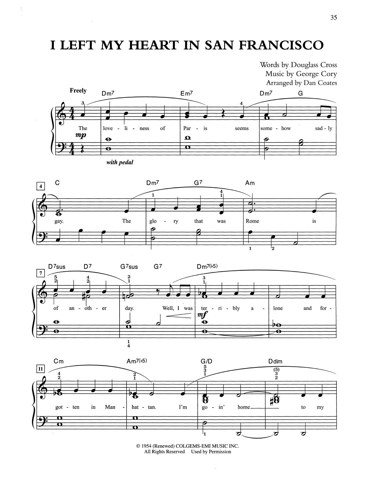 Download or print Tony Bennett I Left My Heart In San Francisco (arr. Dan Coates) sheet music, chords and digital score arranged for Easy Piano. This Jazz score includes 3 page(s).
