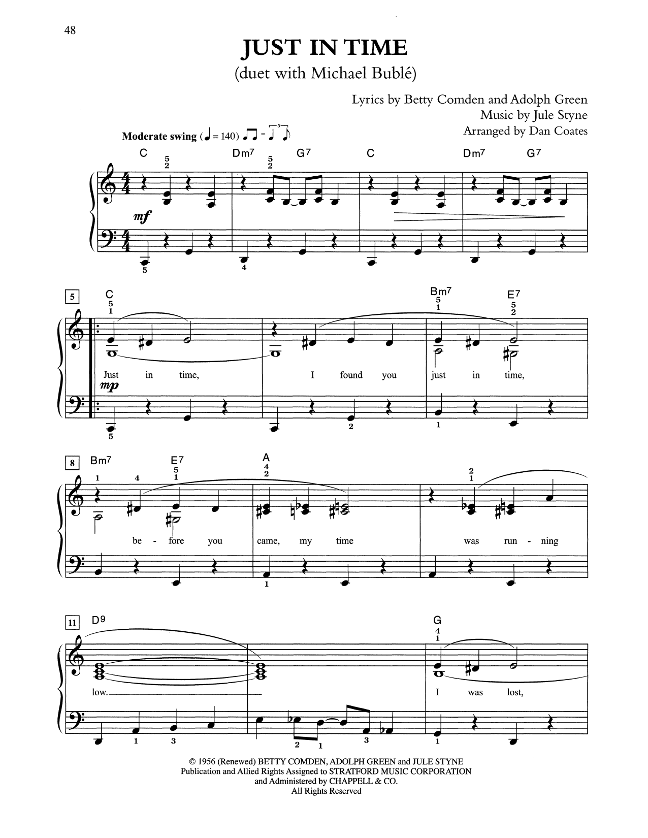 Download or print Tony Bennett & Michael Buble Just In Time (arr. Dan Coates) sheet music, chords and digital score arranged for Easy Piano. This Jazz score includes 3 page(s).