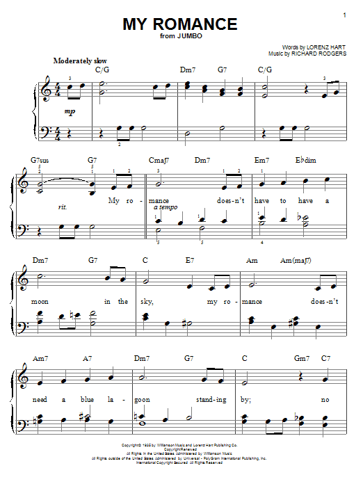 Download or print Tony Bennett My Romance sheet music, chords and digital score arranged for Easy Piano. This Jazz score includes 3 page(s).