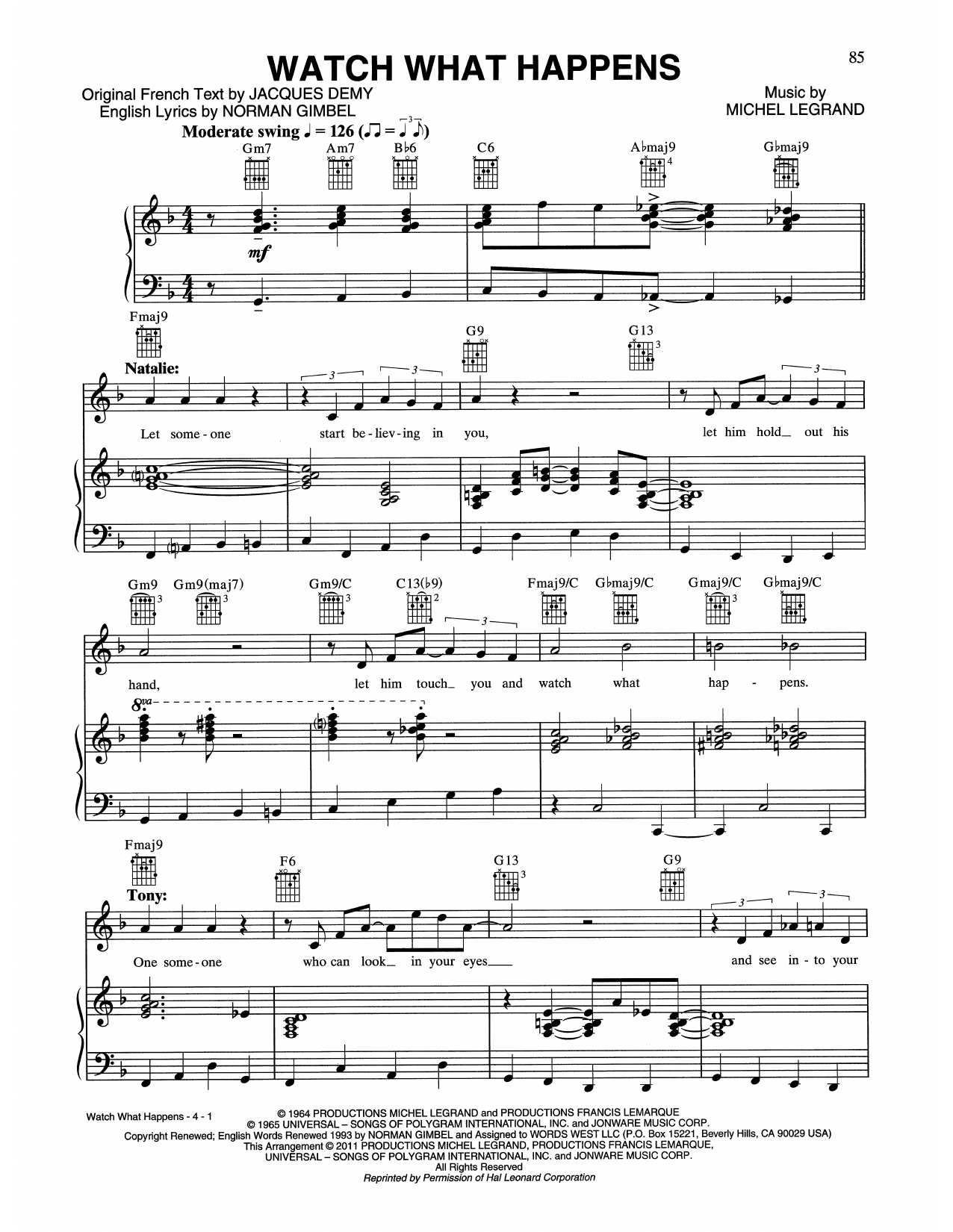 Download or print Tony Bennett & Natalie Cole Watch What Happens sheet music, chords and digital score arranged for Piano, Vocal & Guitar Chords (Right-Hand Melody). This Jazz score includes 4 page(s).