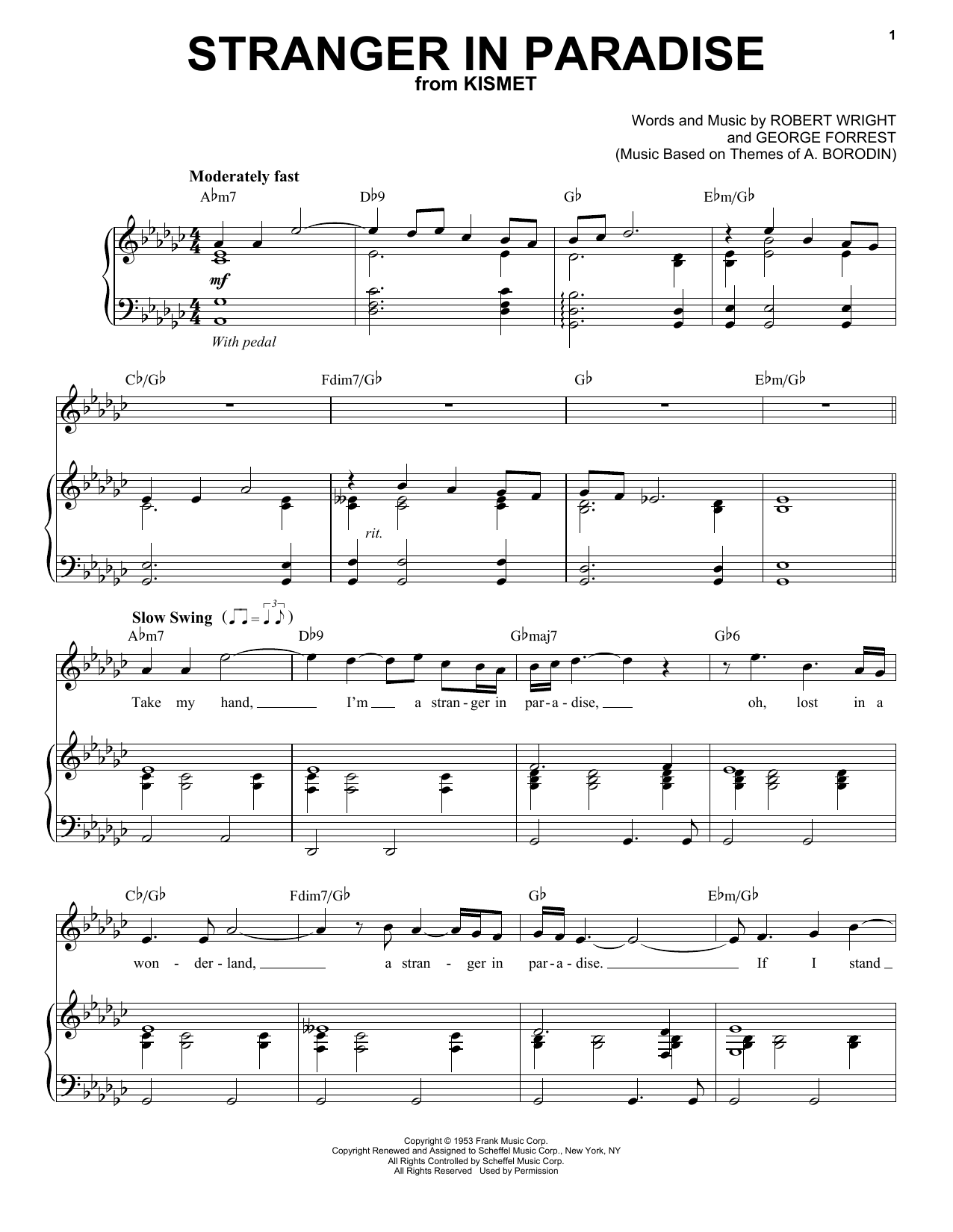 Download or print Tony Bennett Stranger In Paradise sheet music, chords and digital score arranged for Piano & Vocal. This Jazz score includes 4 page(s).