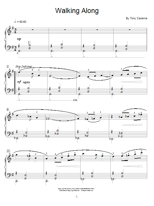 Download or print Tony Caramia Walking Along sheet music, chords and digital score arranged for Educational Piano. This Jazz score includes 4 page(s).