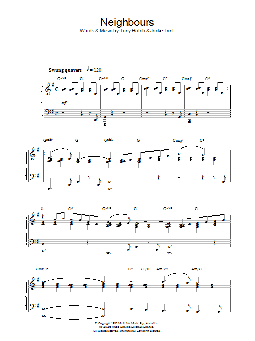 Download or print Tony Hatch Theme From Neighbours sheet music, chords and digital score arranged for Piano Solo. This Film/TV score includes 3 page(s).