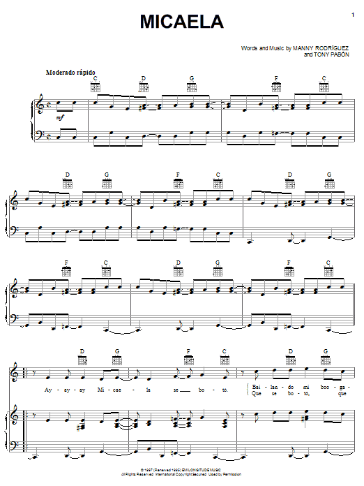 Download or print Manny Rodriguez Micaela sheet music, chords and digital score arranged for Piano, Vocal & Guitar Chords (Right-Hand Melody). This Latin score includes 4 page(s).