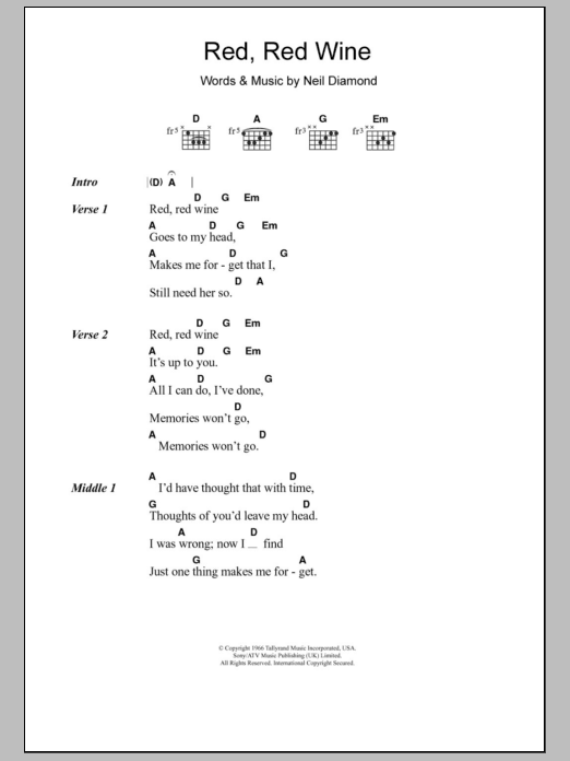 Download or print Tony Tribe Red, Red Wine sheet music, chords and digital score arranged for Guitar Chords/Lyrics. This Reggae score includes 2 page(s).