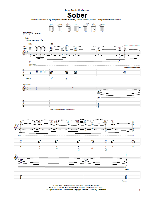 Download or print Tool Sober sheet music, chords and digital score arranged for Guitar Tab (Single Guitar). This Rock score includes 10 page(s).