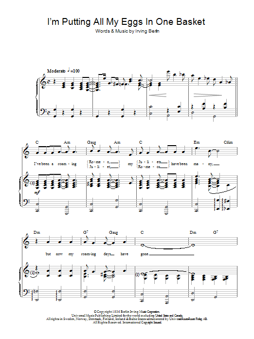 Download or print Top Hat Cast I'm Putting All My Eggs In One Basket sheet music, chords and digital score arranged for Piano, Vocal & Guitar Chords. This Musical/Show score includes 4 page(s).