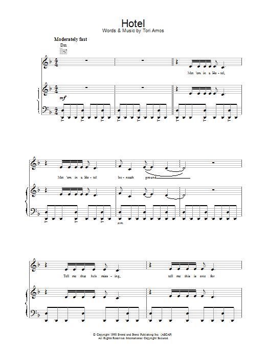 Download or print Tori Amos Hotel sheet music, chords and digital score arranged for Piano, Vocal & Guitar Chords. This Rock score includes 9 page(s).