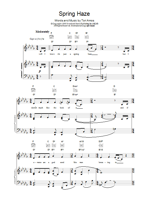 Download or print Tori Amos Spring Haze sheet music, chords and digital score arranged for Piano, Vocal & Guitar Chords. This Pop score includes 11 page(s).