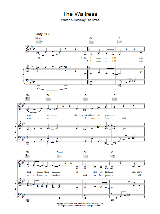 Download or print Tori Amos The Waitress sheet music, chords and digital score arranged for Piano, Vocal & Guitar Chords. This Alternative score includes 5 page(s).