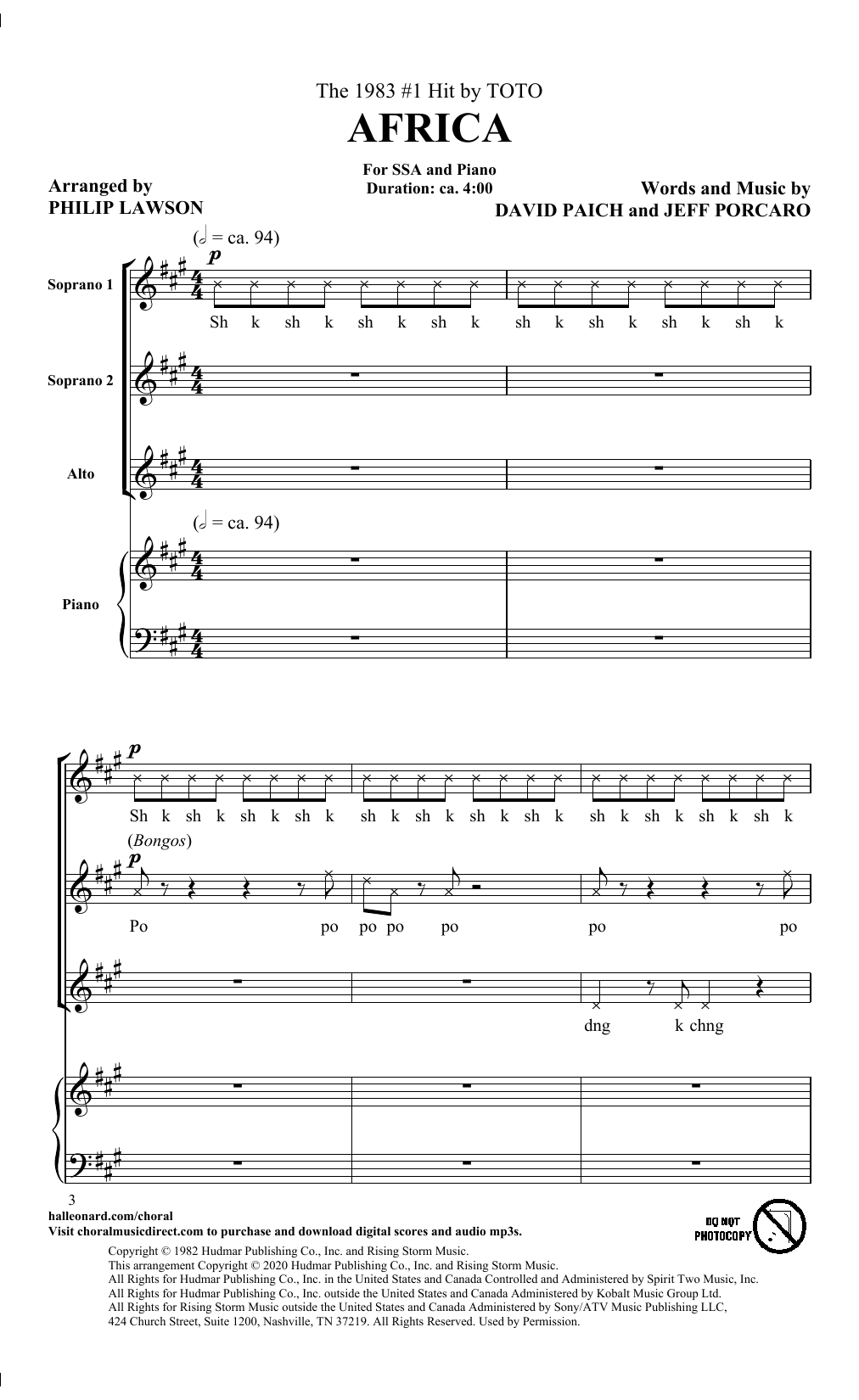 Download or print Toto Africa (arr. Philip Lawson) sheet music, chords and digital score arranged for SSA Choir. This Pop score includes 22 page(s).