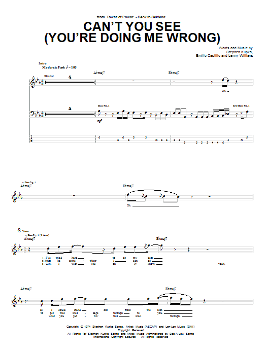 Download or print Tower Of Power Can't You See (You're Doing Me Wrong) sheet music, chords and digital score arranged for Bass Guitar Tab. This Funk score includes 5 page(s).