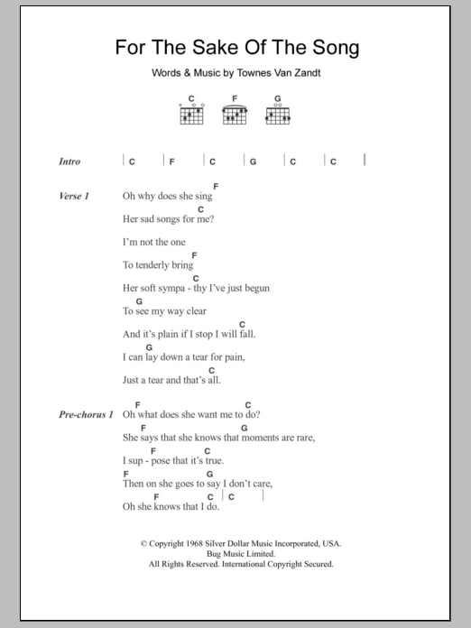 Download or print Townes Van Zandt For The Sake Of The Song sheet music, chords and digital score arranged for Guitar Chords/Lyrics. This Rock score includes 3 page(s).