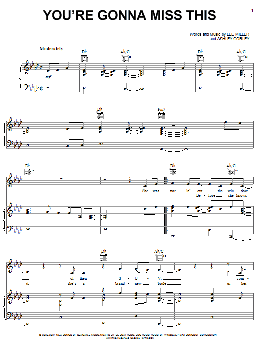 Download or print Trace Adkins You're Gonna Miss This sheet music, chords and digital score arranged for Piano, Vocal & Guitar Chords (Right-Hand Melody). This Country score includes 7 page(s).