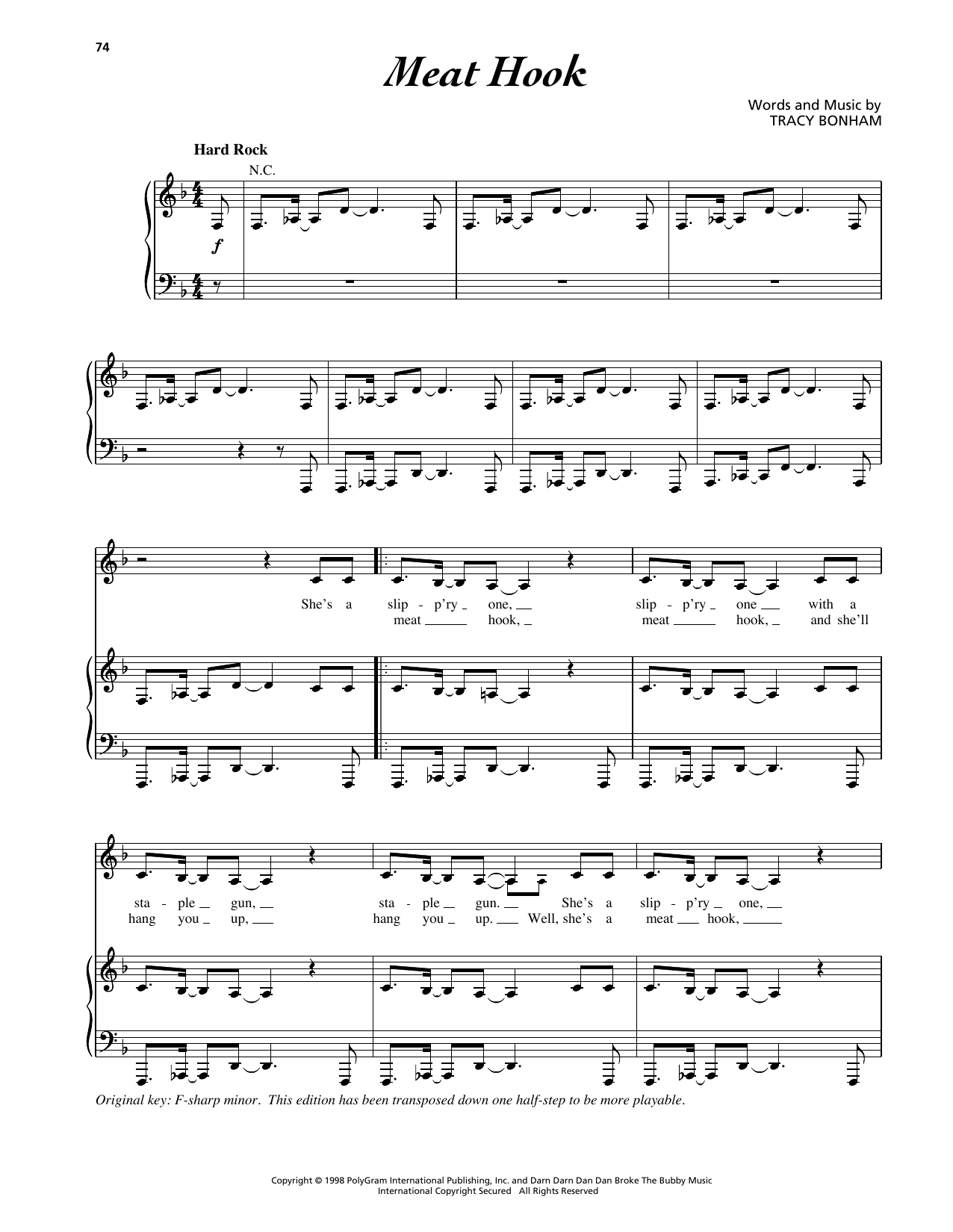 Download or print Tracy Bonham Meat Hook sheet music, chords and digital score arranged for Piano, Vocal & Guitar Chords (Right-Hand Melody). This Pop score includes 5 page(s).