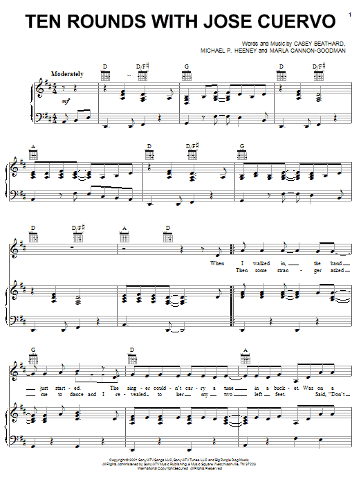 Download or print Tracy Byrd Ten Rounds With Jose Cuervo sheet music, chords and digital score arranged for Piano, Vocal & Guitar Chords (Right-Hand Melody). This Pop score includes 5 page(s).