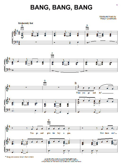 Download or print Tracy Chapman Bang Bang Bang sheet music, chords and digital score arranged for Piano, Vocal & Guitar Chords (Right-Hand Melody). This Folk score includes 7 page(s).