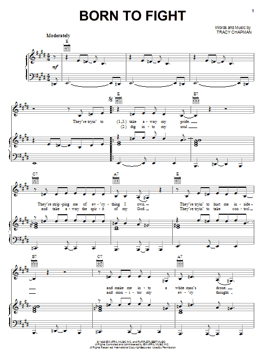 Download or print Tracy Chapman Born To Fight sheet music, chords and digital score arranged for Piano, Vocal & Guitar Chords (Right-Hand Melody). This Folk score includes 4 page(s).