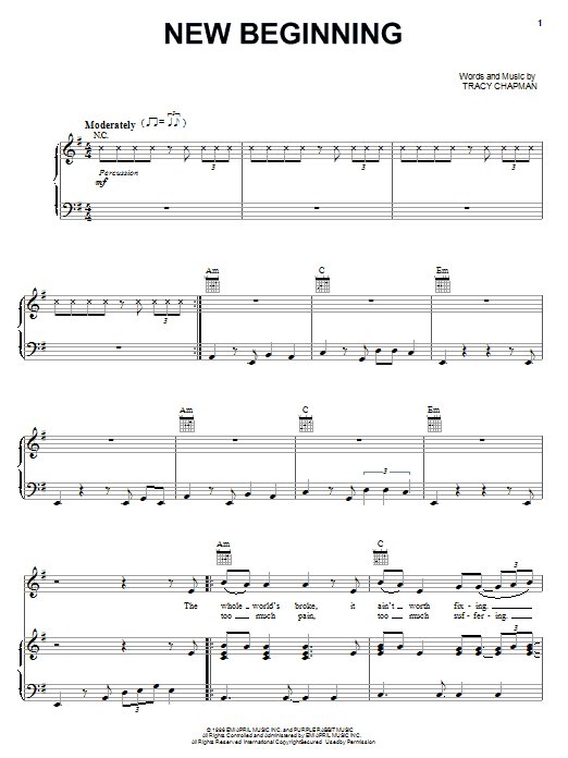 Download or print Tracy Chapman New Beginning sheet music, chords and digital score arranged for Piano, Vocal & Guitar Chords (Right-Hand Melody). This Folk score includes 8 page(s).
