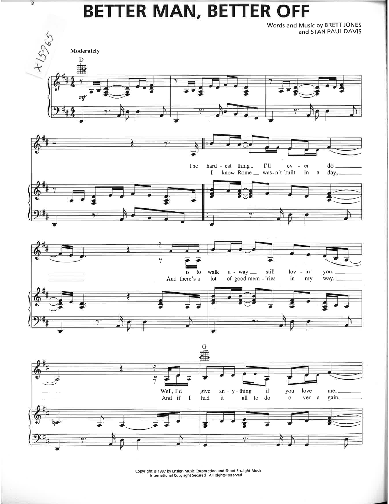 Download or print Tracy Lawrence Better Man, Better Off sheet music, chords and digital score arranged for Piano, Vocal & Guitar Chords (Right-Hand Melody). This Country score includes 6 page(s).