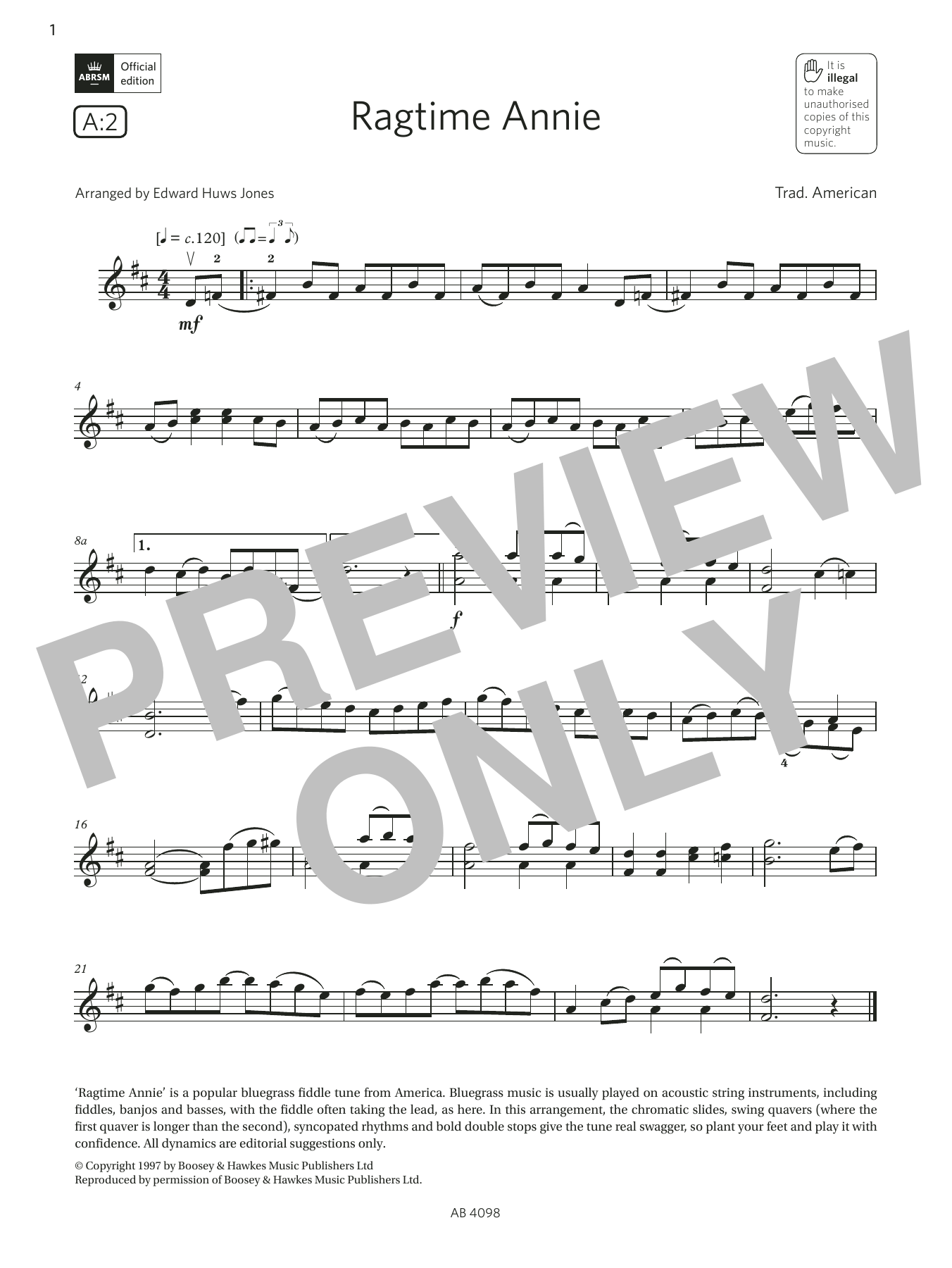 Download or print Trad. American Ragtime Annie (Grade 4, A2, from the ABRSM Violin Syllabus from 2024) sheet music, chords and digital score arranged for Violin Solo. This Classical score includes 3 page(s).