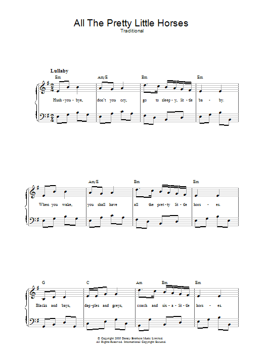 Download or print Southeastern American Folksong All The Pretty Little Horses sheet music, chords and digital score arranged for Easy Piano. This Children score includes 2 page(s).
