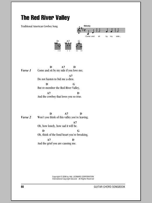 Download or print Traditional American Cowboy So The Red River Valley sheet music, chords and digital score arranged for Piano & Vocal. This Folk score includes 2 page(s).