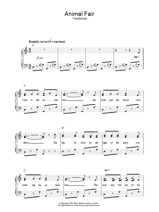 Download or print Traditional Animal Fair sheet music, chords and digital score arranged for Piano, Vocal & Guitar Chords. This Children score includes 2 page(s).