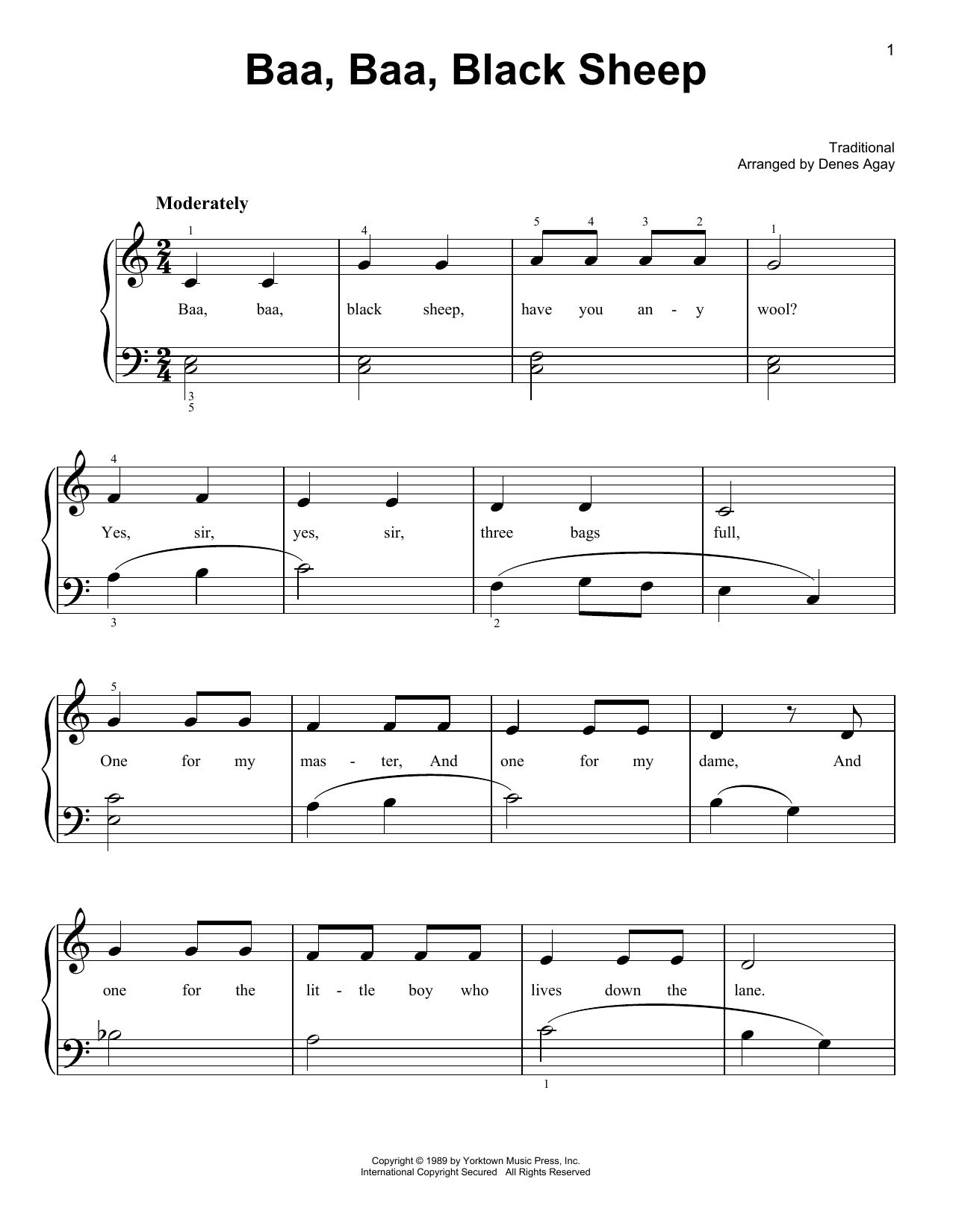 Download or print Traditional Baa Baa Black Sheep (arr. Denes Agay) sheet music, chords and digital score arranged for Easy Piano. This Children score includes 2 page(s).