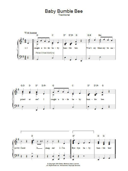 Download or print Traditional Baby Bumble Bee sheet music, chords and digital score arranged for Piano, Vocal & Guitar Chords. This Children score includes 2 page(s).