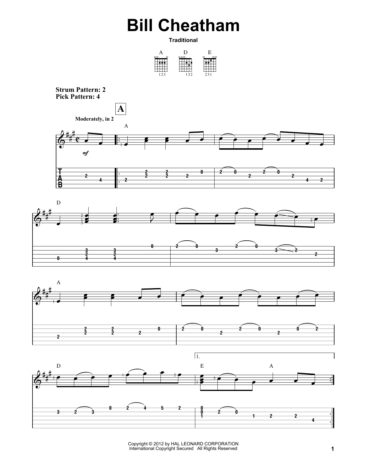 Download or print Traditional Bill Cheatham sheet music, chords and digital score arranged for Guitar Tab (Single Guitar). This Folk score includes 6 page(s).