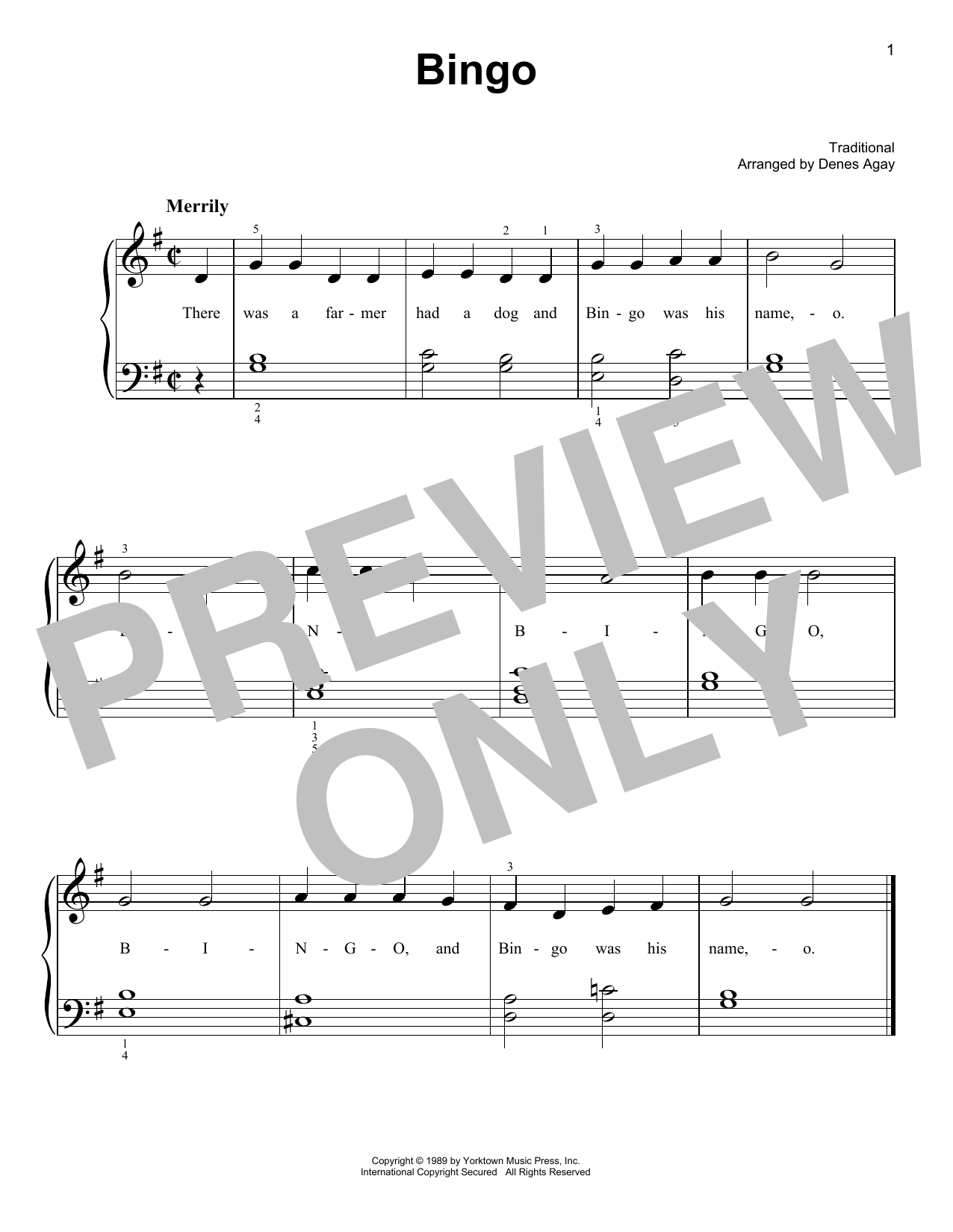 Download or print Traditional Bingo (arr. Denes Agay) sheet music, chords and digital score arranged for Easy Piano. This Children score includes 1 page(s).