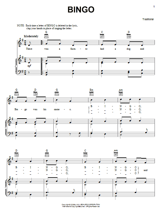 Download or print Traditional Bingo sheet music, chords and digital score arranged for Piano & Vocal. This Children score includes 3 page(s).