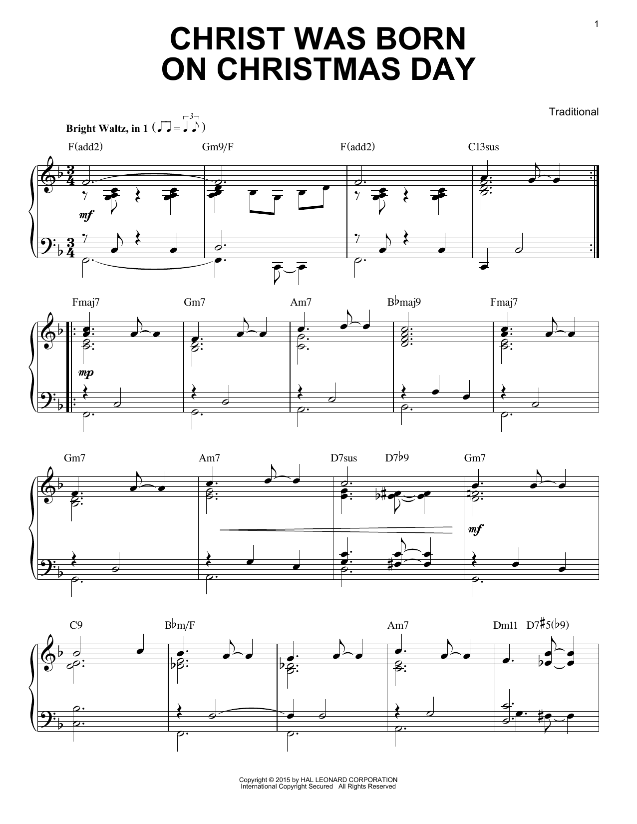 Download or print Traditional Christ Was Born On Christmas Day [Jazz version] (arr. Brent Edstrom) sheet music, chords and digital score arranged for Piano Solo. This Christmas score includes 3 page(s).