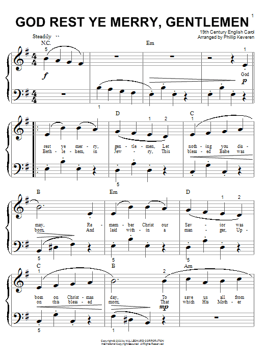 Download or print 19th Century English Carol God Rest Ye Merry, Gentlemen (arr. Phillip Keveren) sheet music, chords and digital score arranged for Beginning Piano Solo. This Christmas score includes 3 page(s).