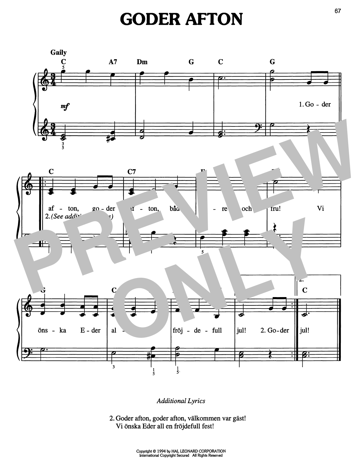Download or print Traditional Carol Goder Afton sheet music, chords and digital score arranged for Easy Piano. This Disney score includes 1 page(s).