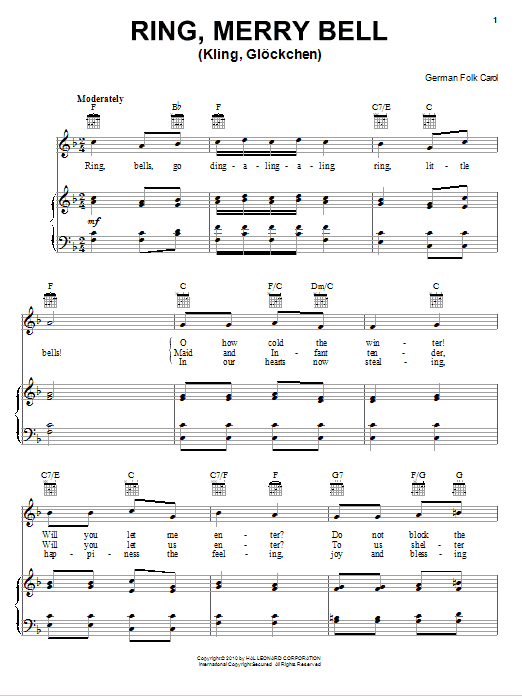 Download or print Traditional German Carol Kling, Glockchen (Ring, Merry Bell) sheet music, chords and digital score arranged for Piano, Vocal & Guitar Chords (Right-Hand Melody). This Christmas score includes 2 page(s).