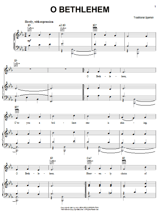 Download or print Traditional Spanish O Bethlehem sheet music, chords and digital score arranged for Piano, Vocal & Guitar Chords (Right-Hand Melody). This Christmas score includes 2 page(s).