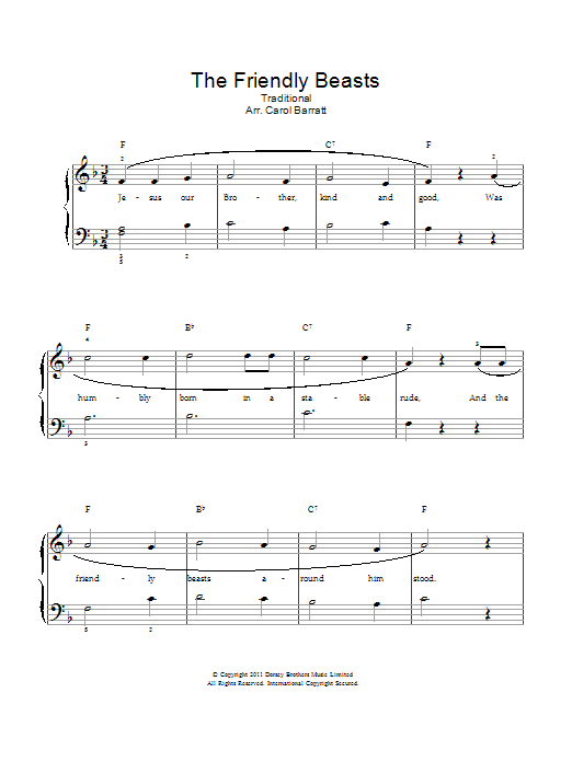 Download or print Christmas Carol The Friendly Beasts sheet music, chords and digital score arranged for Piano & Vocal. This Christmas score includes 2 page(s).